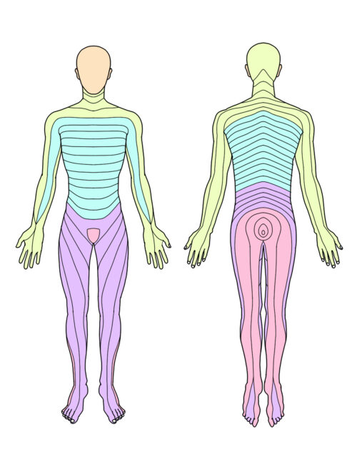 イラストで色分けされているように、それぞれの神経がつながる場所が決まっているため、例えば足の小指が痺れている場合は仙骨、足の親指が痺れている場合は腰椎五番目と、痺れている部分を詳細にチェックすることで、ヘルニアの場所がわかることも多いです。