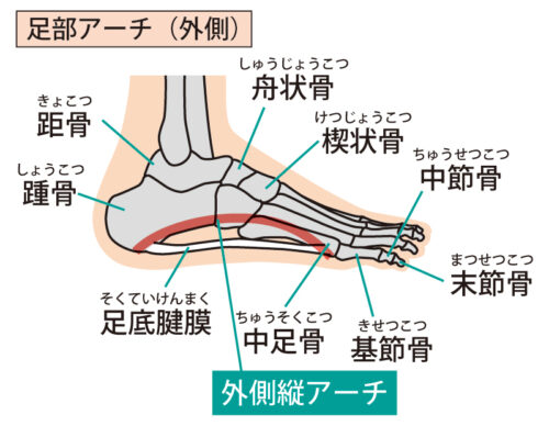土踏まずには、外アーチと内アーチの二つの縦アーチと、足指の付け根にある横アーチがあります。