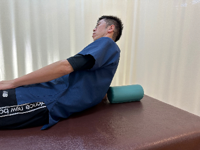 ①円柱状のクッション、または丸めたタオルを背中(肩甲骨の間)に当てた状態で寝る
