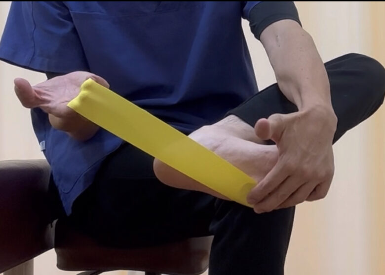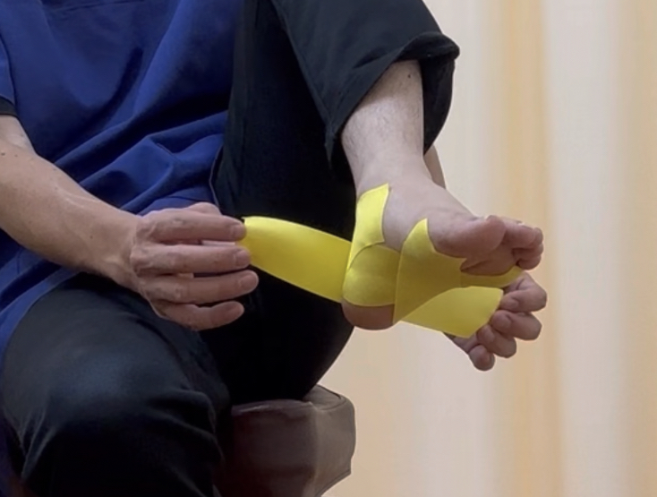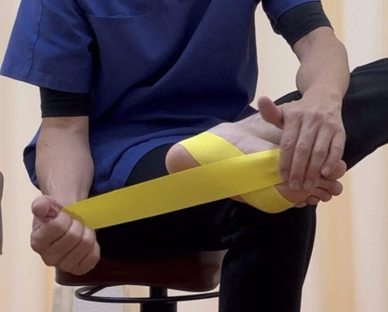 それでは足底腱膜炎を改善するための、足裏のアーチの崩れを予防し、かかとを安定させるテーピングの貼り方をお伝えします。
