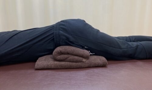 階段状においたタオルの端っこ部分に、骨盤前側の一番出てるところを乗せるように寝てみてください。