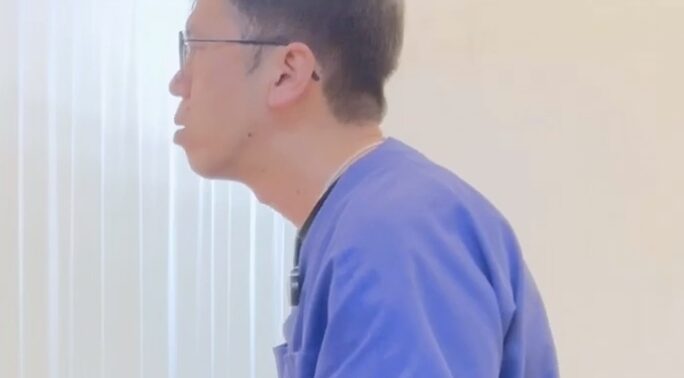 この姿勢から頭を少し前に出すと、下を向いてしまいますので顔を正面に向けます。