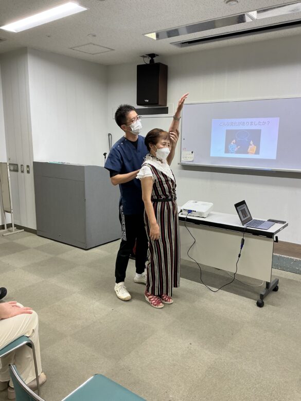 途中、簡単なエクササイズで体の変化を感じていただいた後、それぞれの方のお身体を少し見せていただくことに。