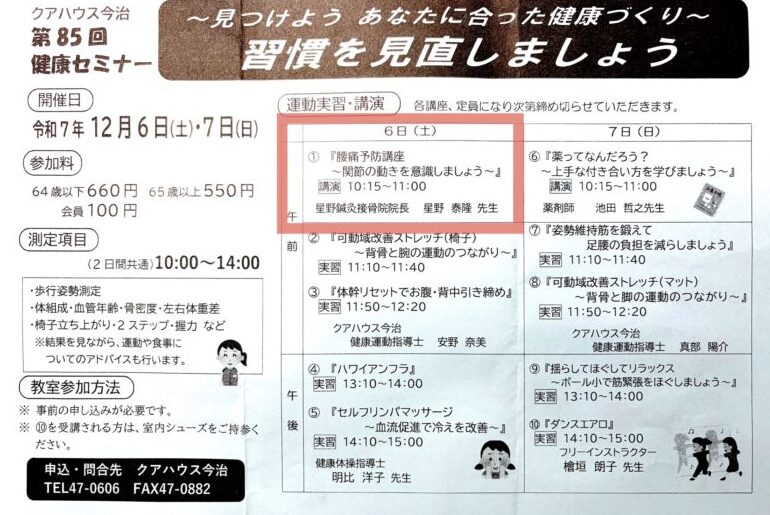 12月6日土曜日にクアハウス今治で行われる健康セミナーで、腰痛予防講座を開催いたします。