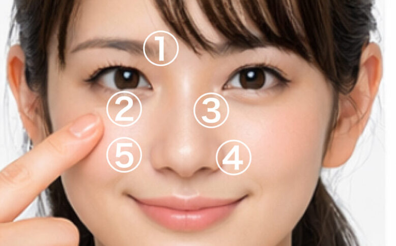 眉頭、黒目の下、鼻頭、小鼻の横、小鼻の横で黒目の下。